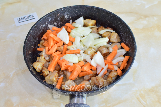 Следом выложите морковь и лук. Обжаривайте все вместе 2-3 минуты, до появления характерного аромата.