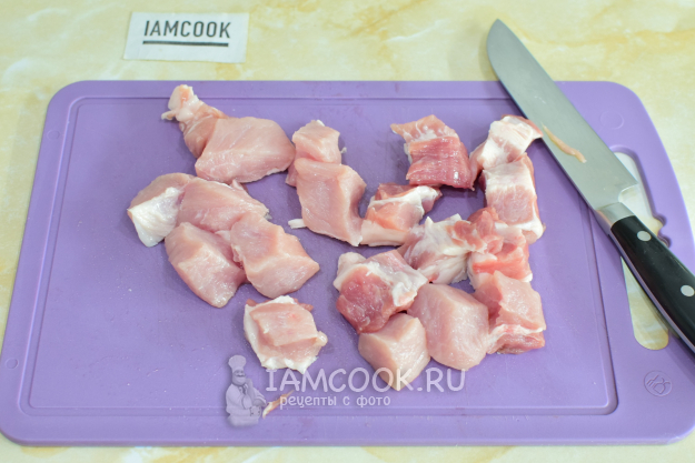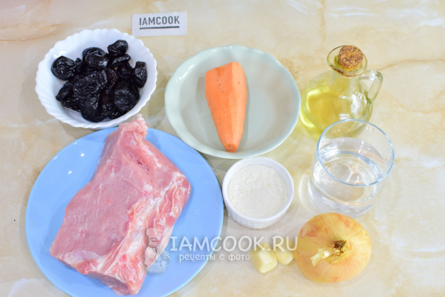 Для приготовления тушеной свинины с черносливом на сковороде соберите все необходимые ингредиенты по списку. Мясо берите без костей. Хорошим вариантом будет свиная шея или окорок.