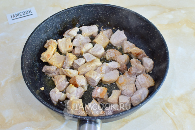 На горячую сковороду налейте немного растительного масла и выложите нарезанное мясо. Обжаривайте его до подрумянивания.