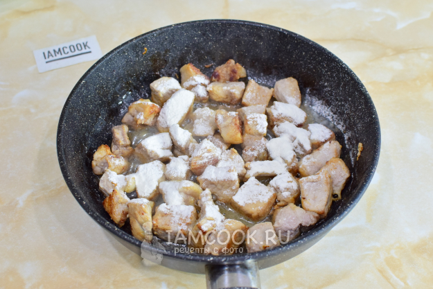 Обжаренное мясо посыпьте тонким слоем муки. Перемешайте.