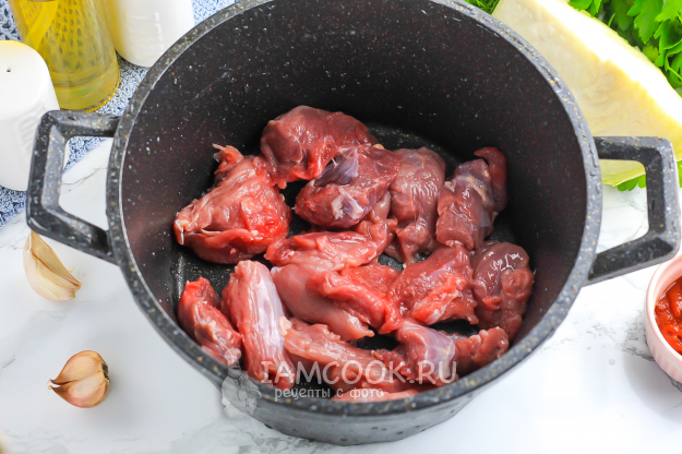 Говядину промойте в воде и срежьте жилы и пленки. Выложите в казан или кастрюлю и залейте горячей водой. Отварите в течение 1 часа. Говядина варится примерно полтора часа, но с учетом варки и остальных продуктов, до их закладки говядину нужно варить минимум 1 час.
