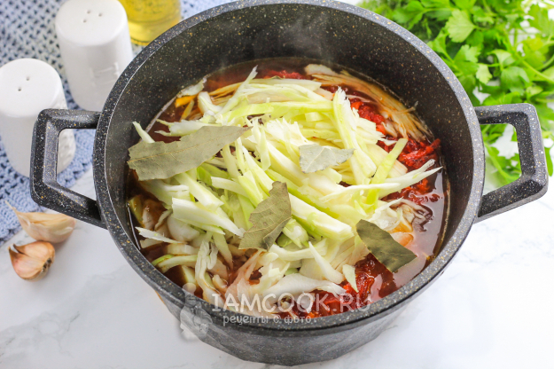 Выложите приготовленную зажарку в бульон. Всыпьте соль, сахар и перемешайте. Нарежьте капусту и выложите туда же. Добавьте лавровые листья. Отварите в течение 5-8 минут.
