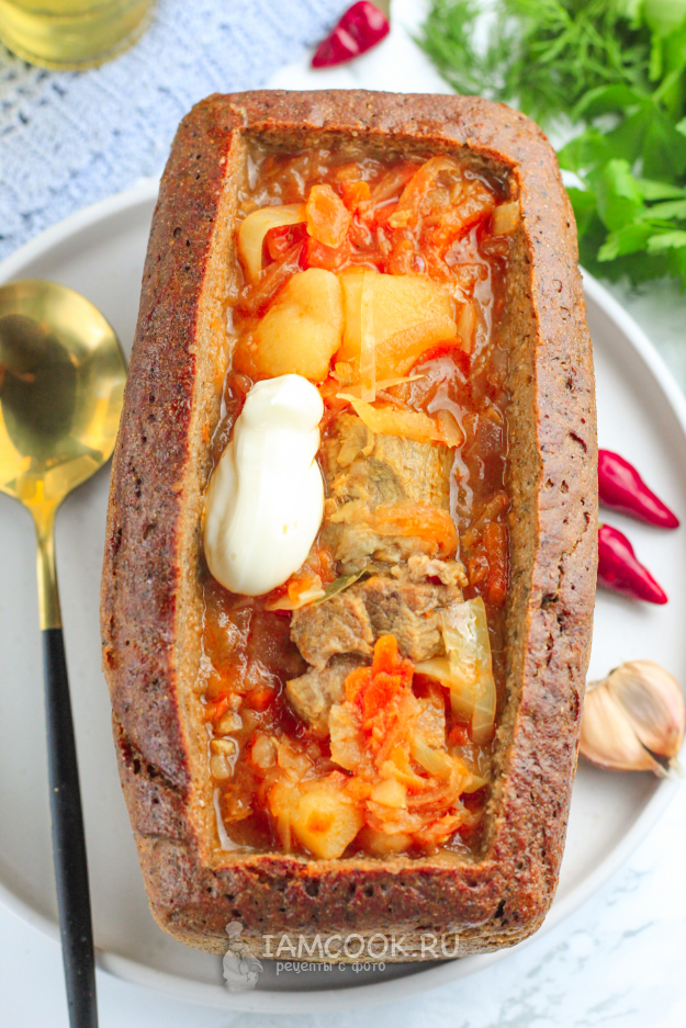 Выложите горячий борщ с мясом в хлеб и сразу же подайте к столу со сметаной, майонезом и т.д. Имейте в виду, что хлеб быстро впитывает жидкость, поэтому заполняйте его борщом непосредственно перед подачей!