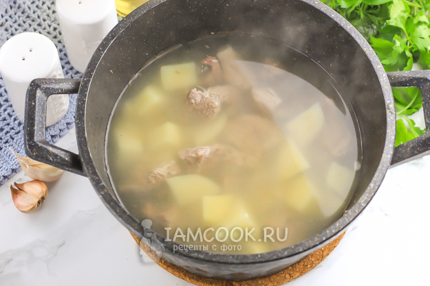 После закипания жидкости обязательно удалите образовавшуюся пену и варите говядину на умеренном нагреве. Очистите картофель и промойте. Нарежьте средними кубиками и добавьте в казан. Отварите 15 минут. Если жидкости будет не хватать, то просто долейте кипяток.