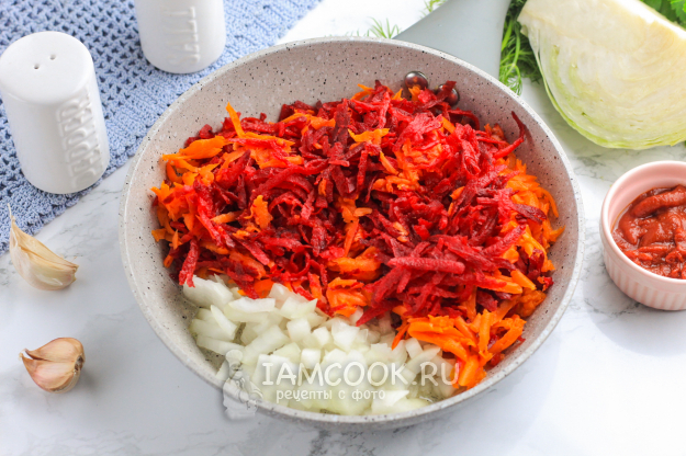 Очистите свеклу, морковь и лук от кожуры, промойте. Натрите морковь и свеклу на терке с крупными ячейками, а лук нарежьте кубиками. Пассеруйте на сковороде в растительном масле 5-8 минут.