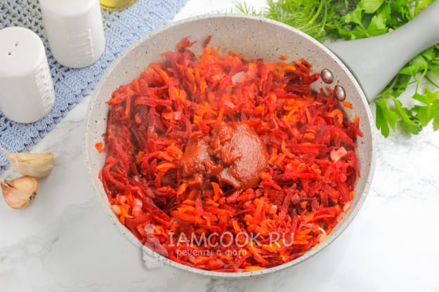 Выложите томатную пасту, перемешайте и томите еще 2-3 минуты.