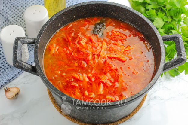 Спрессуйте очищенные зубчики чеснока, проварите борщ еще 2-3 минуты и выключите нагрев. Накройте емкость крышкой и дайте супу пропариться минимум 10 минут.