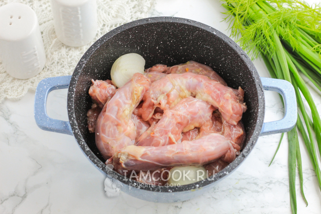 Выложите их в казан или кастрюлю. Очистите мелкий репчатый лук и промойте. Разрежьте пополам и добавьте в емкость. Овощ добавляется для придания бульону аромата, поэтому закладывается вместе с мясными частями.