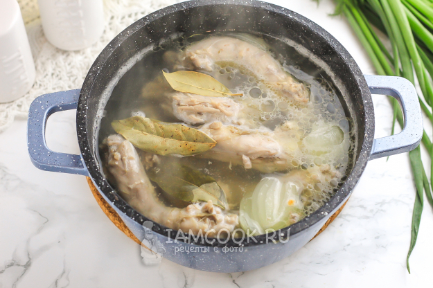 Отварите бульон примерно 25 минут, а затем всыпьте лавровые листья и приправу для курицы. Если ее нет в наличии, то добавьте 0,25 ч.л. соли и 2 щепотки черного молотого перца. Проварите еще 5 минут.
