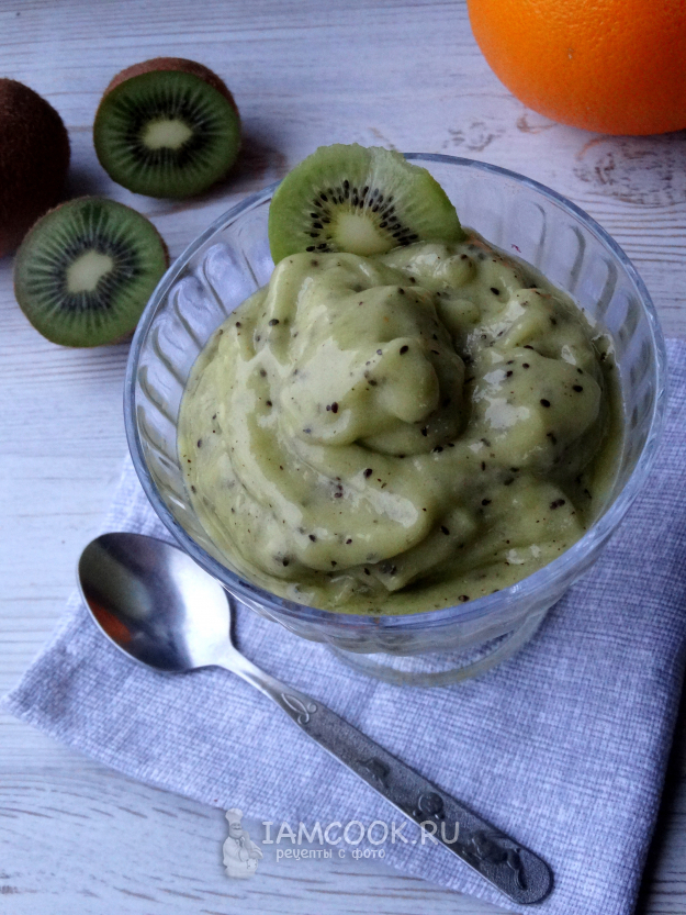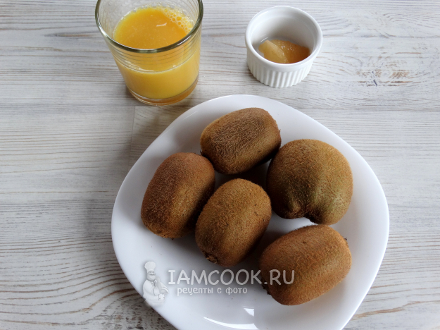 Чтобы приготовить сорбет из киви, возьмите киви, мёд или сахар, сок или воду.