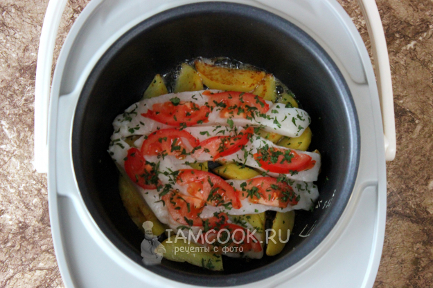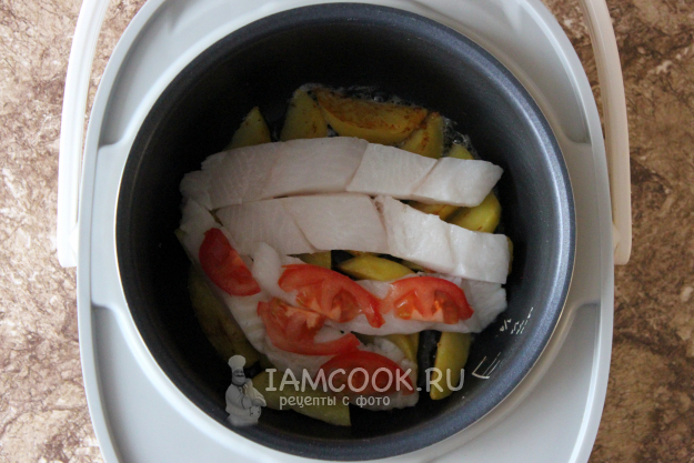 Укройте куски палтуса ломтиками помидоров.