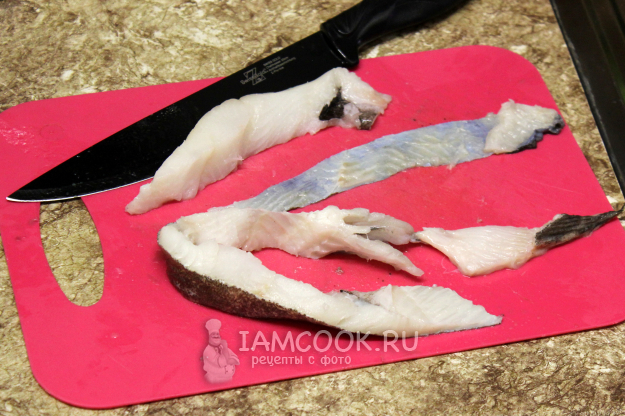 Со стейков палтуса снимите филе.