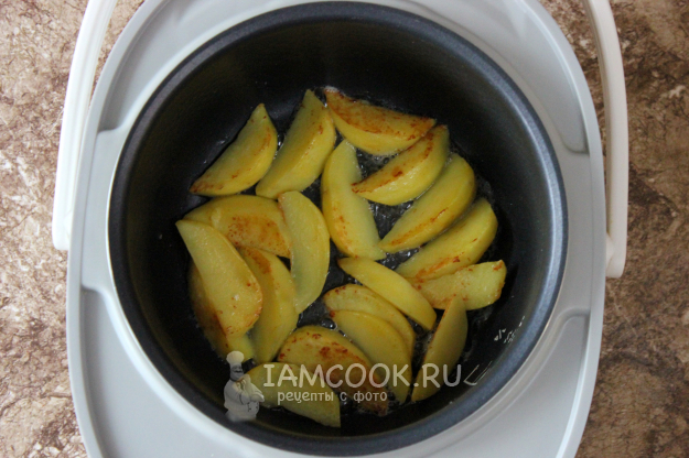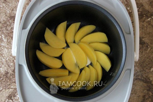 Картофель очистите и нарежьте ломтями или брусками как для жарки. В чаше мультиварки на дно положите кусочки сливочного масла и сверху - ломти картофеля.