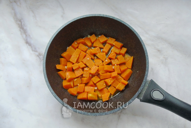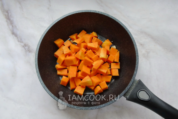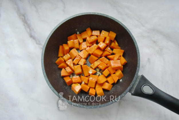 Тыкву очистите от семян и кожуры. Помойте и нарежьте небольшими кубиками. Добавьте в сковороду с чесноком.