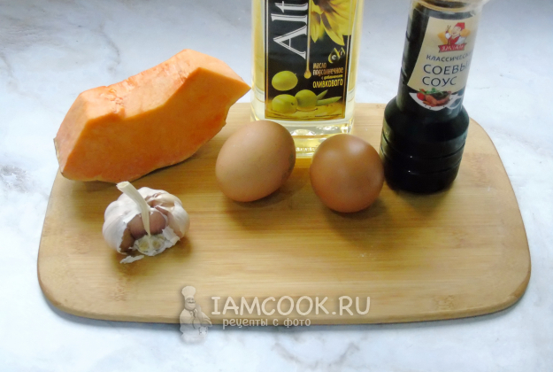 Соберите ингредиенты для приготовления тыквы с яйцами на сковороде.