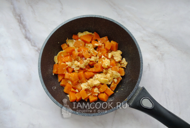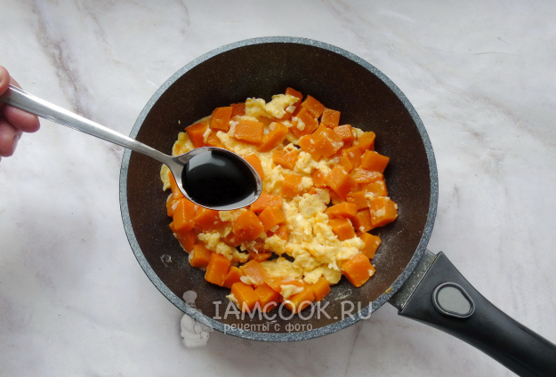 Жарьте яйца с тыквой на сковороде, перемешивая, 2-3 минуты. В конце добавьте соевый соус.