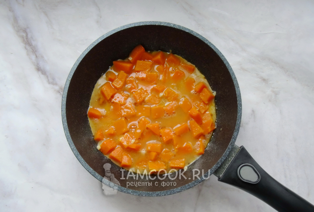 После налейте 3-4 столовые ложки воды, накройте сковороду крышкой и тушите тыкву до мягкости на огне чуть ниже среднего. На это потребуется 8-10 минут.
