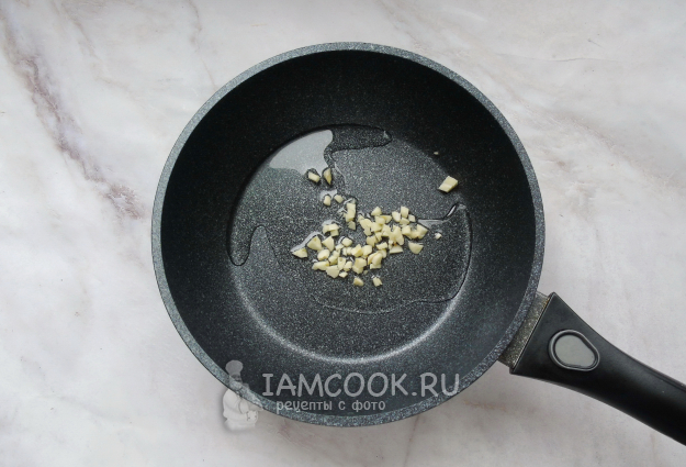 Чеснок очистите, помойте и мелко нарежьте. Выложите на горячую сковороду с подсолнечным маслом.