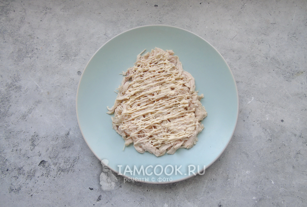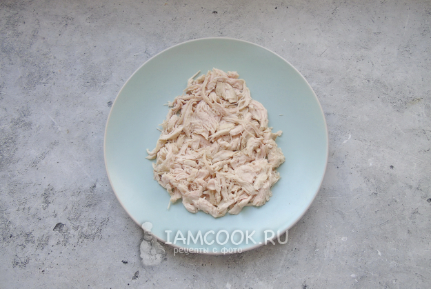 Куриное филе отварите. Для этого его помойте, выложите в кастрюлю и залейте водой. Доведите до кипения, огонь убавьте и снимите пену. Посолите по вкусу. Варите курицу до мягкости, 15-20 минут. После достаньте из кастрюли, охладите и разделите на волокна. Выложите на большую тарелку в форме пламени.