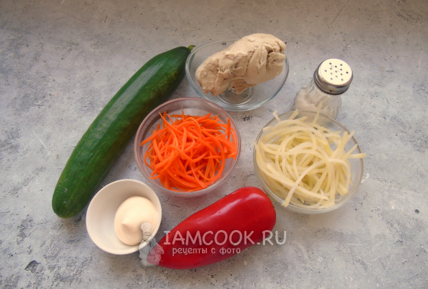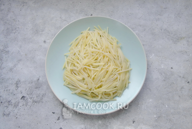 Следующий слой - картофель по-корейски. Выложите его на слой огурцов. Если морковь по-корейски всегда можно приобрести в торговой сети, то картофель встречается не часто. Но его можно приготовить самим. Картошку очистите и натрите на терке для моркови по-корейски. Затем хорошо промойте в воде. В кастрюле вскипятите воду и выложите картофель. Варите 4 минуты. После откиньте на дуршлаг и дайте хорошо стечь воде. Переложите в миску, добавьте соль, сахар, перец черный молотый, приправу для моркови по-корейски. Хорошо разогрейте растительное масло и залейте им картофель. Добавьте яблочный уксус и снова перемешайте. Поставьте в холод на 2 часа.