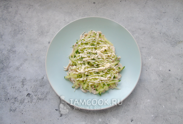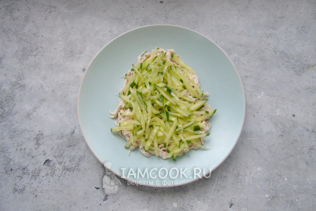Огурец помойте и нарежьте соломкой. Немного посолите и посыпьте сахаром, перемешайте. Дайте огурцу постоять 7-8 минут. Затем отожмите лишнюю жидкость и выложите на куриное филе.