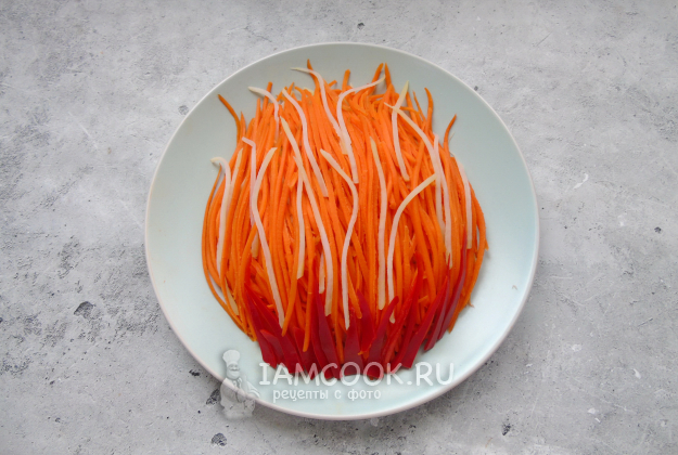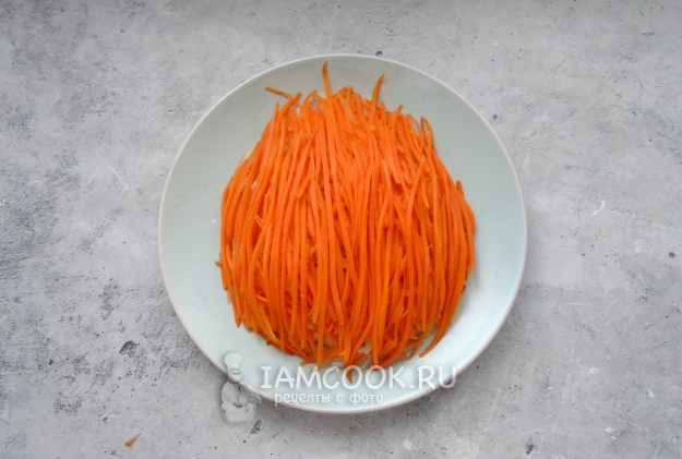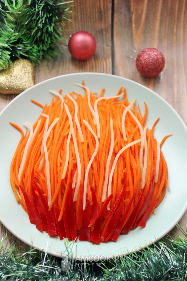 На слой картофеля выложите морковь по-корейски, полностью накрывая предыдущий слой. Из отдельных полосок моркови сделайте язычки пламени.