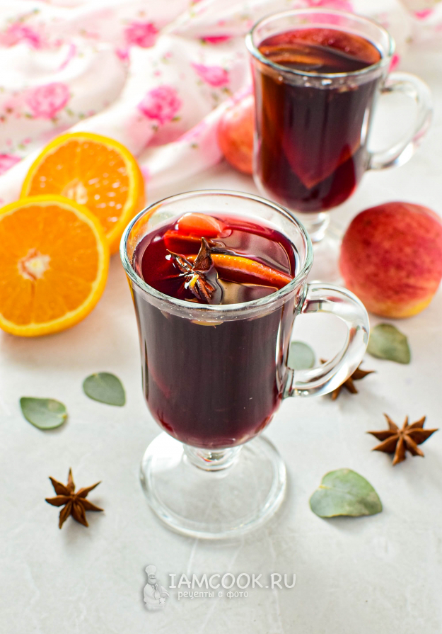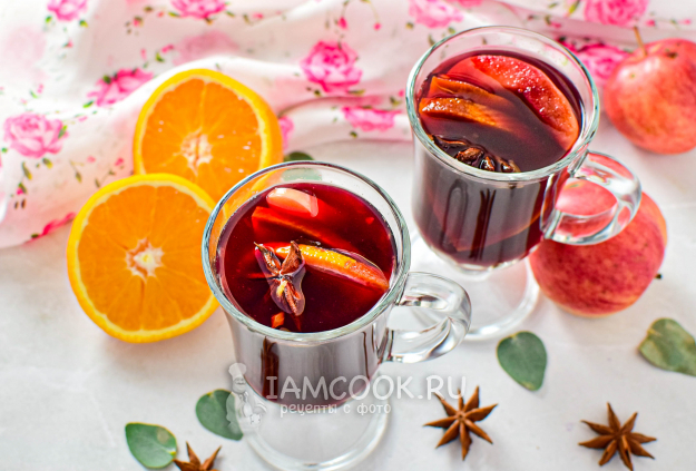 Готовый глинтвейн с апельсином и яблоком разлейте в стаканы и угощайтесь.