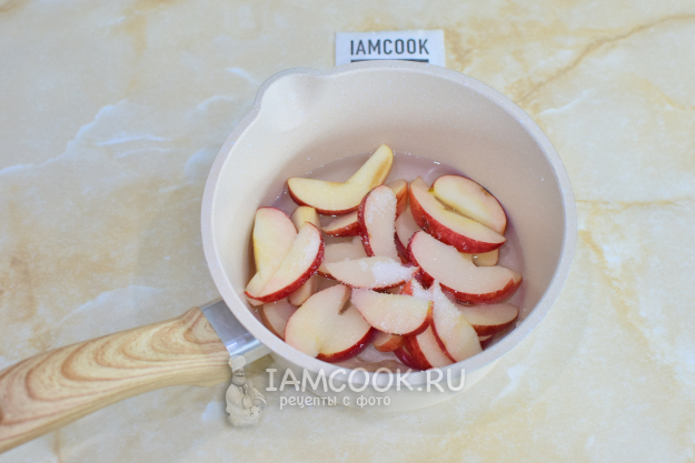 Из яблок удалите сердцевину и нарежьте их ломтиками. Залейте яблоки водой, добавьте немного сахара и доведите до кипения.