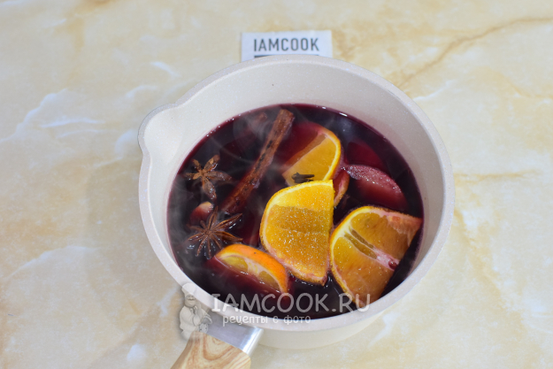 Следом влейте вино. Верните все на огонь. Доведите до кипения и снимите с огня. Кипятить глинтвейн не надо.
