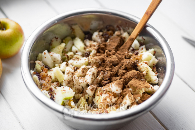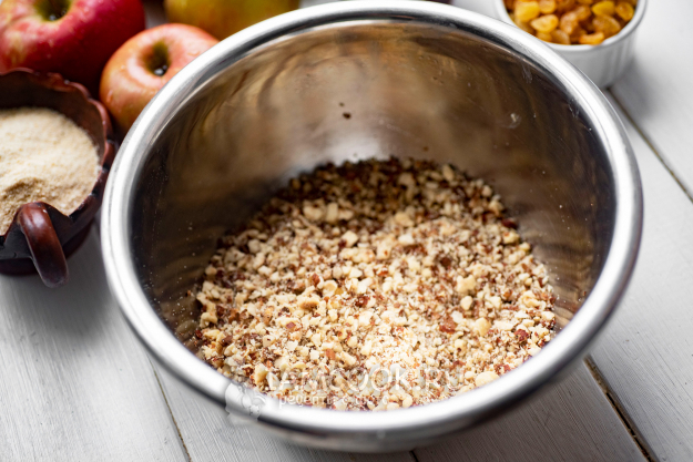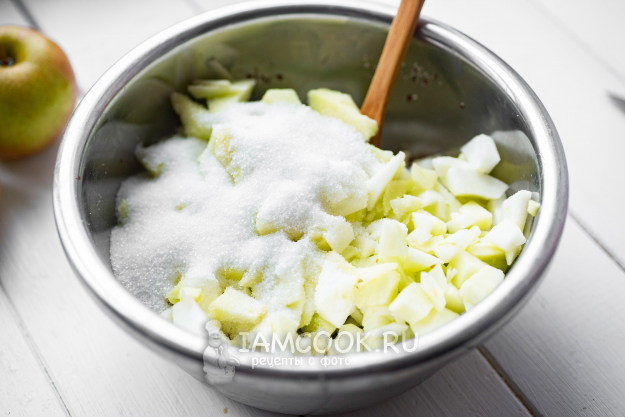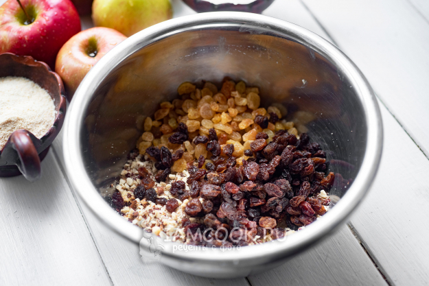 Яблоки добавим в миску к орехам и изюму, добавим сахар.