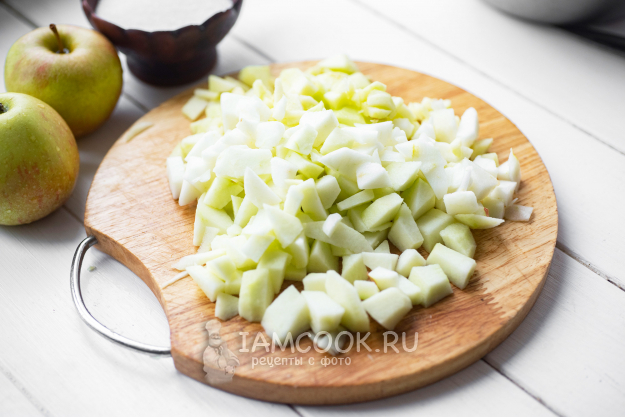 С яблок снимем кожуру и удалим семена, нарежем маленькими кусочками.