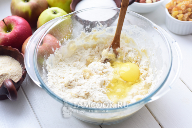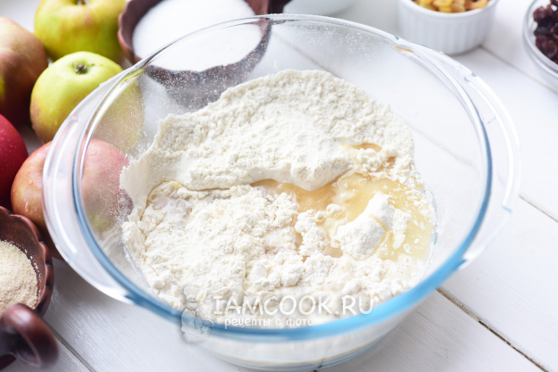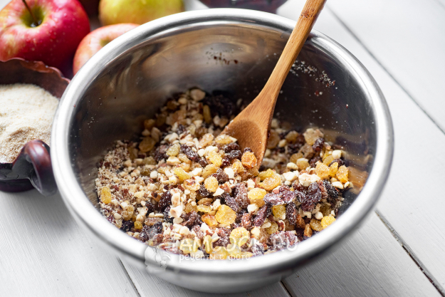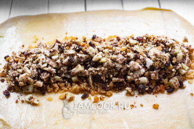 Затем разложим тесто и на центр выложим сначала панировочные сухари, поверх выложим начинку из яблок, орехов и изюма.