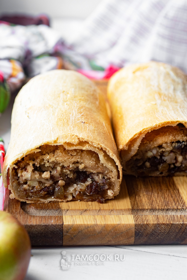 Нарезаем готовый штрудель с яблоками, изюмом и орехами и подаем к столу. Приятного аппетита!