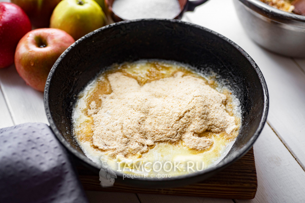 В сковороде растопим на маленьком огне сливочное масло, выложим панировочные сухари, будем обжаривать их, помешивая, 4-5 минут.