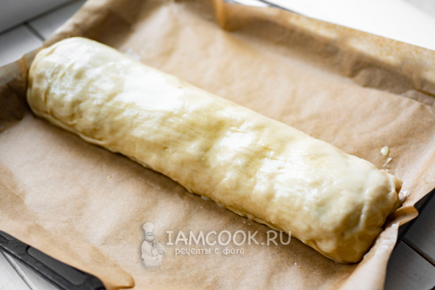 Затем скатаем из теста с начинкой рулетик, подворачивая края. Поверхность теста можно смазать с помощью кулинарной кисти взболтанным яйцом. Штрудель выложим на противень, застеленный пергаментом для выпечки, и отправим выпекаться на 45 минут в уже разогретую до 180 градусов духовку.