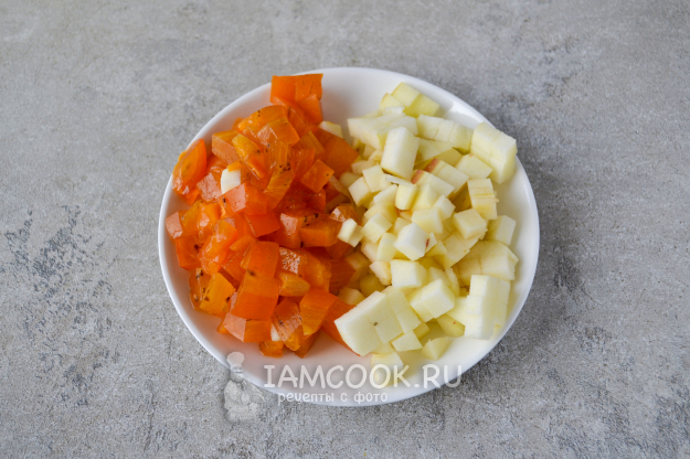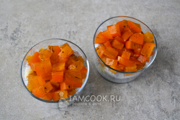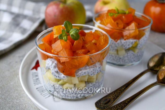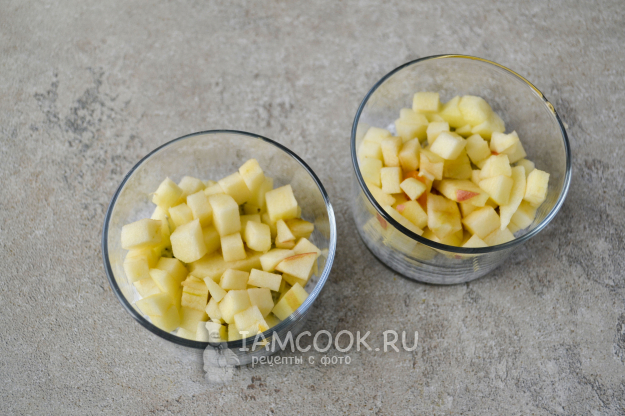 Вымойте яблоко и хурму. Яблоко можно очистить от кожуры, чтобы десерт получился более нежным. Нарежьте хурму на мелкие кубики. У яблока вырежьте семенную камеру и нарежьте мякоть таким же мелким кубиком.