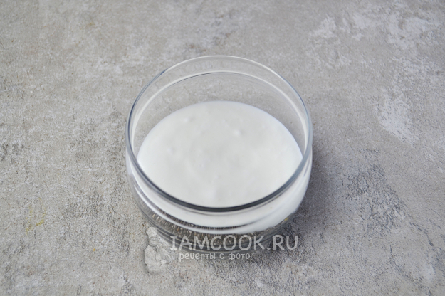 Влейте кефир. Вместо кефира можно использовать натуральный йогурт, ряженку.