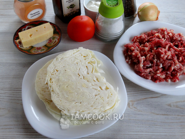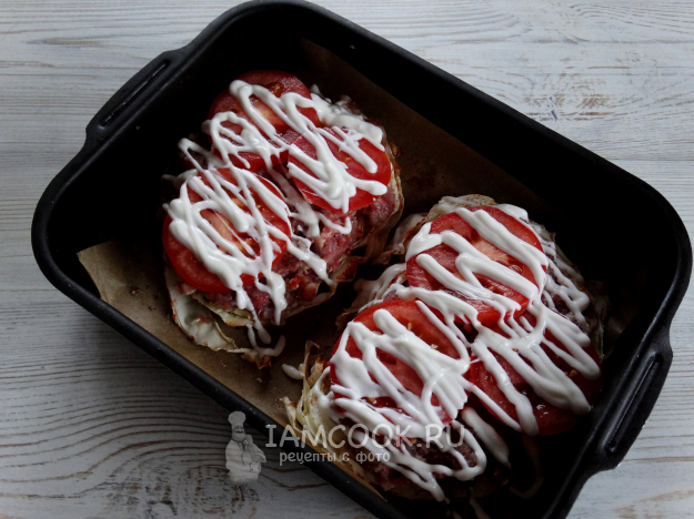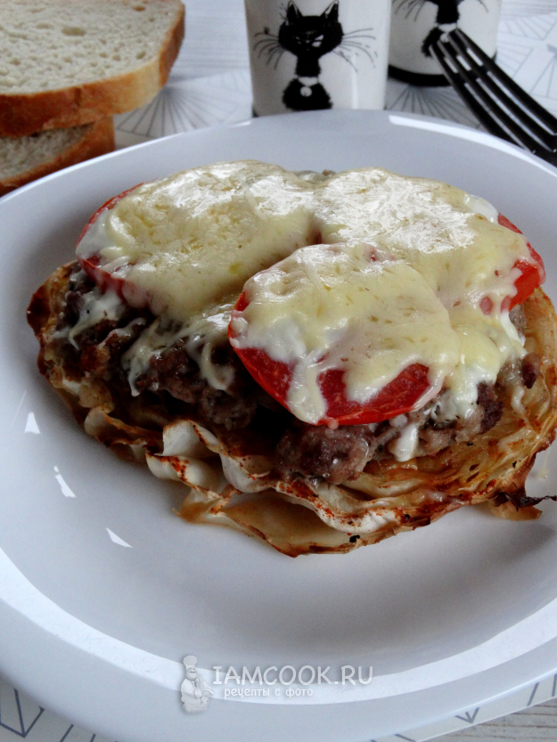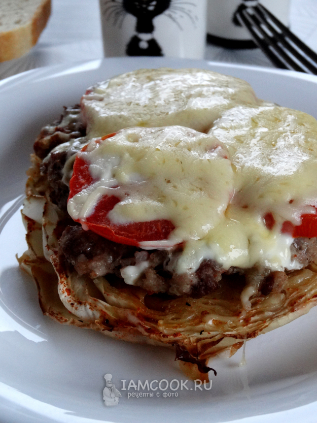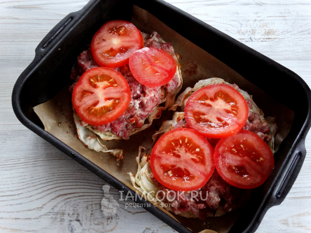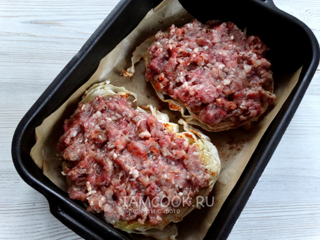 Разложить фарш на стейки из капусты.