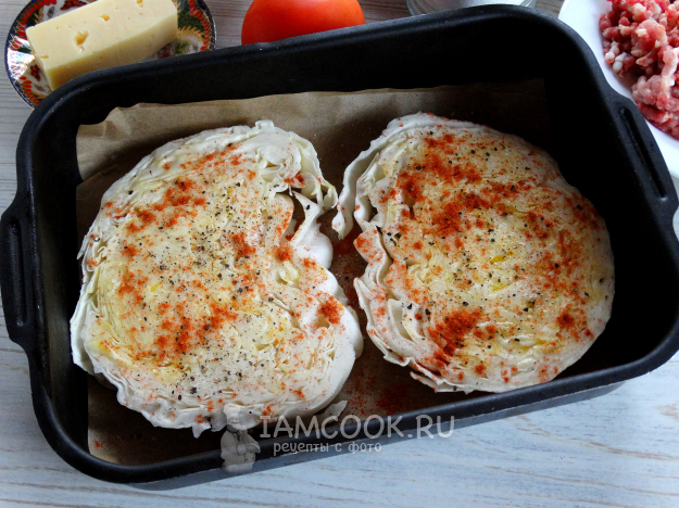 Выложить капусту на противень или в форму. Промазать маслом, подсолить, поперчить, посыпать паприкой (1 ч.л.).