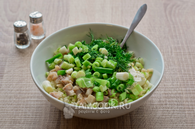Зелень укропа и лука ополосните и нарежьте мелко. Переложите зелень в миску со всеми ингредиентами.