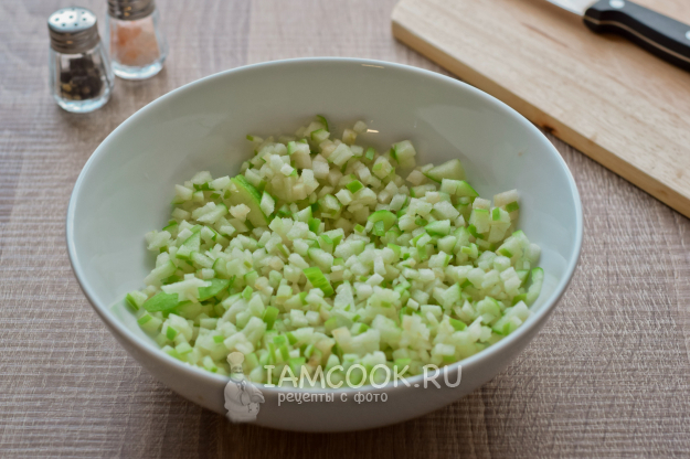 Вымойте яблоко и просушите. Разрежьте пополам, после чего удалите сердцевину и нарежьте яблоко сперва пластинами, затем максимально мелким кубиком. Переложите нарезку в глубокую миску, сбрызните лимонным соком, чтобы яблоко не потемнело.
