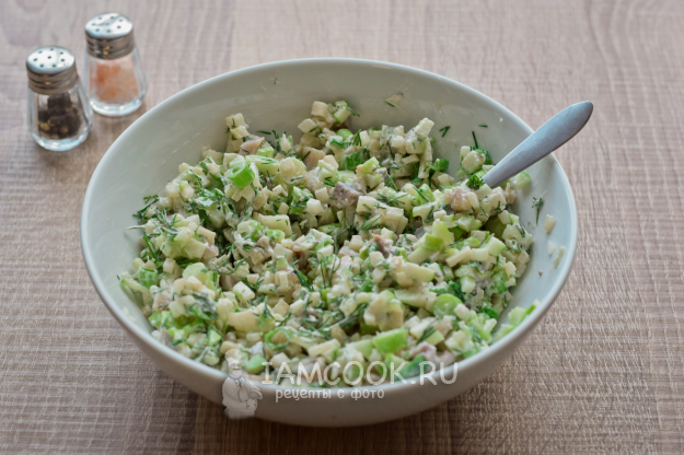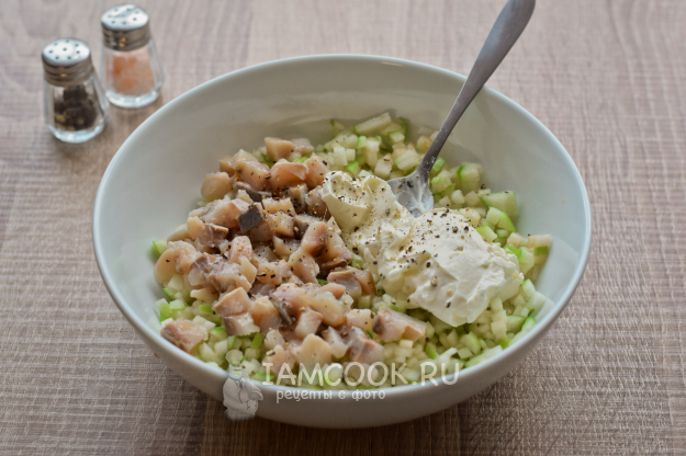 Филе сельди нарежьте мелкими кубиками. Добавьте селедку к яблоку. Также сразу добавьте сливочный сыр и ложку майонеза. Для аромата всыпьте щепотку свежемолотого черного перца.