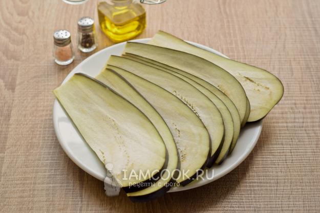 Баклажан ополосните и просушите, после чего нарежьте его тонкими пластинами.