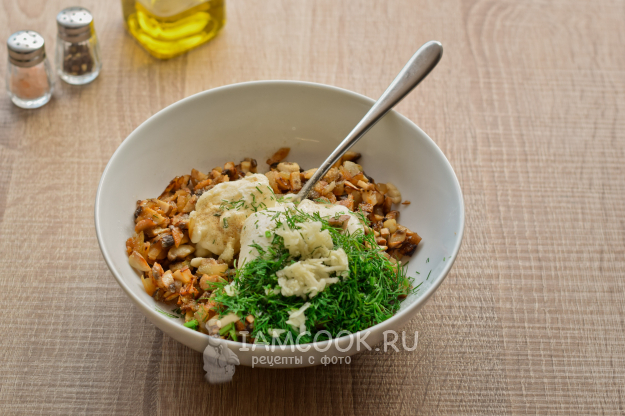 Горячие грибы переложите в тарелку, добавьте сливочный сыр, майонез, нарезанный укроп и измельченный в прессе чеснок. Также всыпьте соль и перец по вкусу. Перемешайте все, начинка готова.