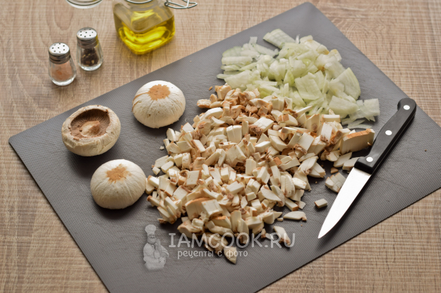 Лук очистите и ополосните, грибы почистите. Нарежьте лук и шампиньоны мелкими кубиками.