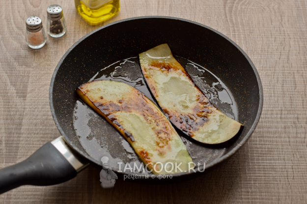 В сковороде разогрейте масло, выкладывайте по две-три пластины баклажана и жарьте их с каждой стороны по несколько минут, до золотистого цвета.