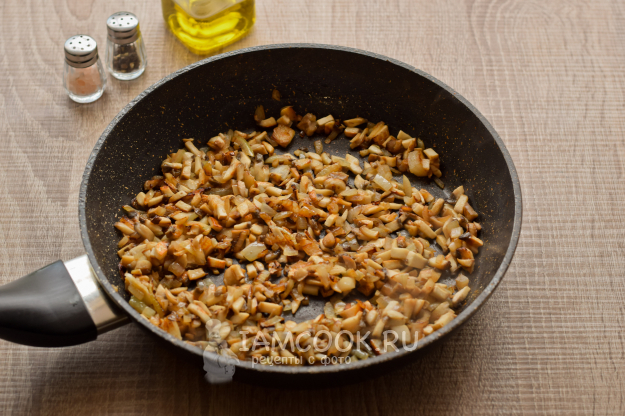 В сковороде разогрейте немного растительного масла, выложите лук, жарьте его несколько минут помешивая. После добавьте к луку грибы, жарьте, помешивая, 8-10 минут, до готовности.