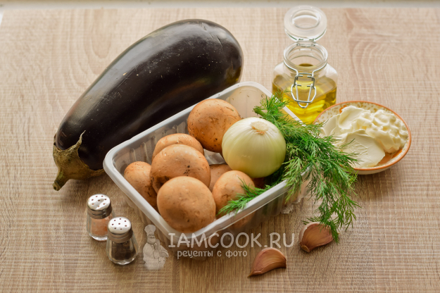 Подготовьте грибы, один крупный или несколько средних по размеру баклажанов и другие ингредиенты по списку.