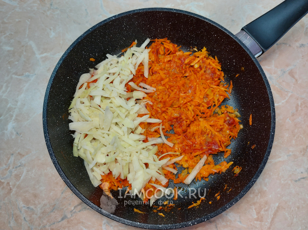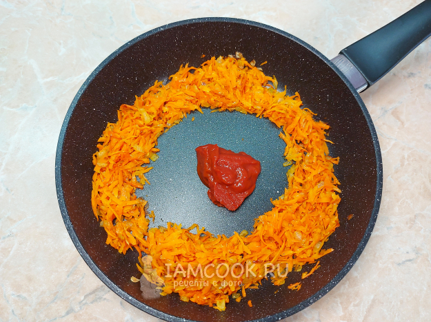 Пассеровать оставшийся измельчённый лук и морковь в течение нескольких минут, затем в центр сковороды выложить томатную пасту и обжарить 1-2 минуты.