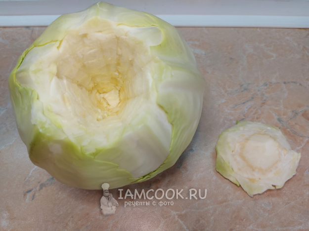 Капусту очистить от грязных, повреждённых верхних листьев. Аккуратно вырезать кочерыжку и затем ещё немного углубиться, чтобы срезать толстые основания листьев.